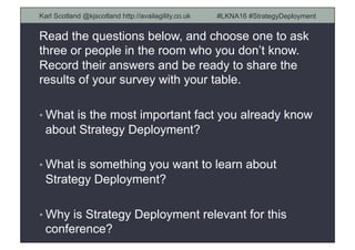 The document outlines Karl Scotland's presentation on strategy deployment with the X-matrix. It discusses key aspects of strategy deployment including catchball, the X-matrix, getting started, and concludes with exercises for the audience. The presentation covers aligning strategy throughout an organization, using the X-matrix tool to define strategies, outcomes, and tactics, and establishing regular improvement cycles using experiments.