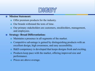The document outlines the strategic management and performance of Digby from 2009 to 2015, emphasizing their mission to offer premium products and competitive advantages through broad differentiation. Key decisions made by various CEOs focused on R&D, marketing, labor management, and cost reduction strategies, resulting in fluctuating performance metrics such as EPS and contribution margins across different rounds. The future strategy includes capacity expansion, cost reduction, and establishing a dividend policy, supported by substantial retained earnings.