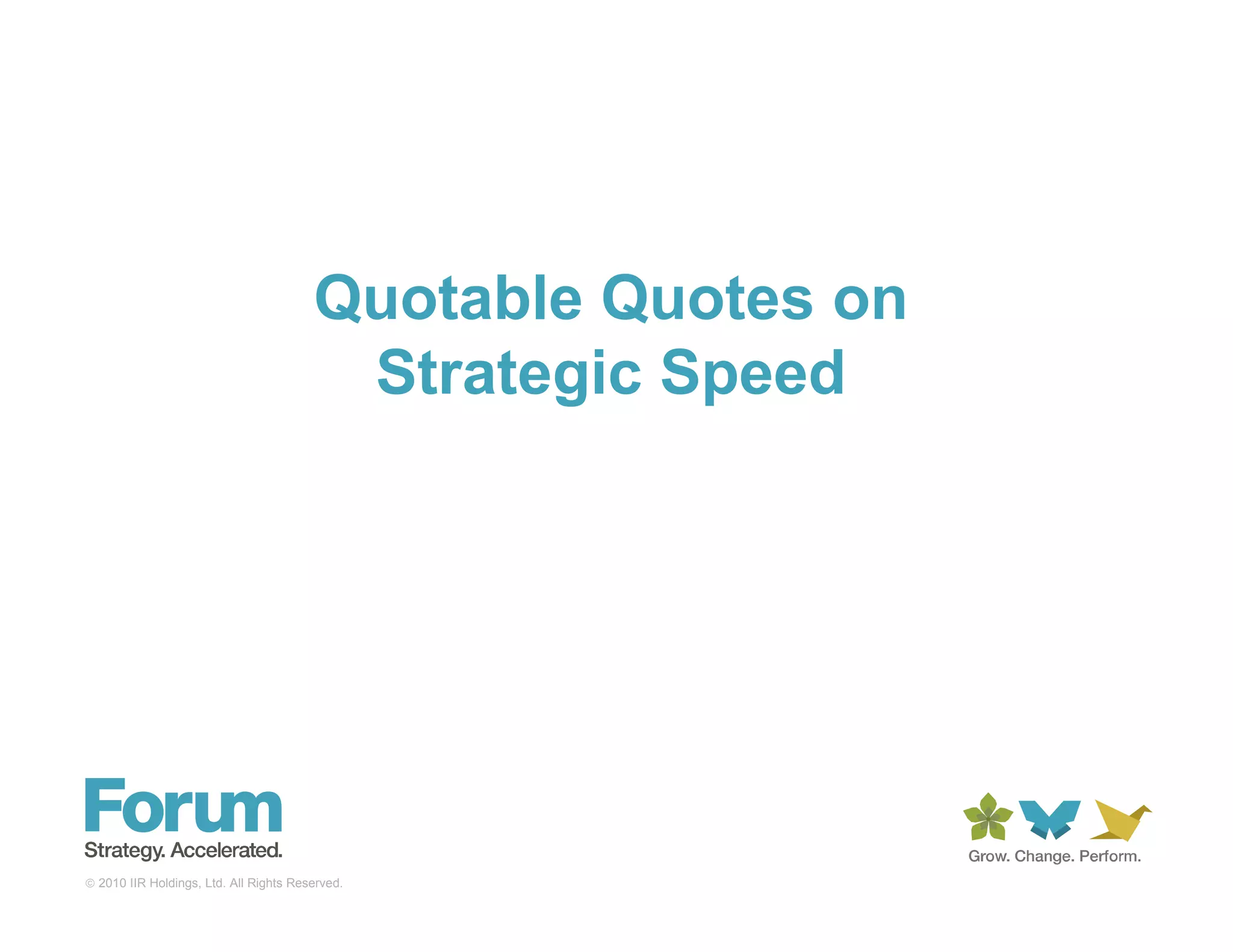 The document presents a collection of quotes centered on the concept of strategic speed in organizations, emphasizing that successful execution relies not just on strategy quality, but also on acceptance and learning. It argues that companies that prioritize learning and transparency can achieve faster decision-making and better outcomes, while excessive focus on traditional metrics or consensus can hinder progress. Additionally, it highlights the importance of addressing organizational complexity and fostering a culture of agility to adapt and execute strategies effectively.