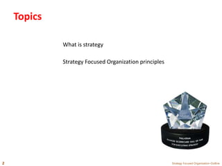 The document outlines principles for creating a strategy focused organization, including mobilizing change through executive leadership, translating strategy into operational terms, aligning the organization to the strategy, motivating everyone to implement the strategy, and governing to make strategy a continuous process. It discusses establishing urgency, creating a leadership team, developing vision and strategy, using a strategy map and balanced scorecard, communication, incentives, and closing strategic feedback loops to continually refine strategy.