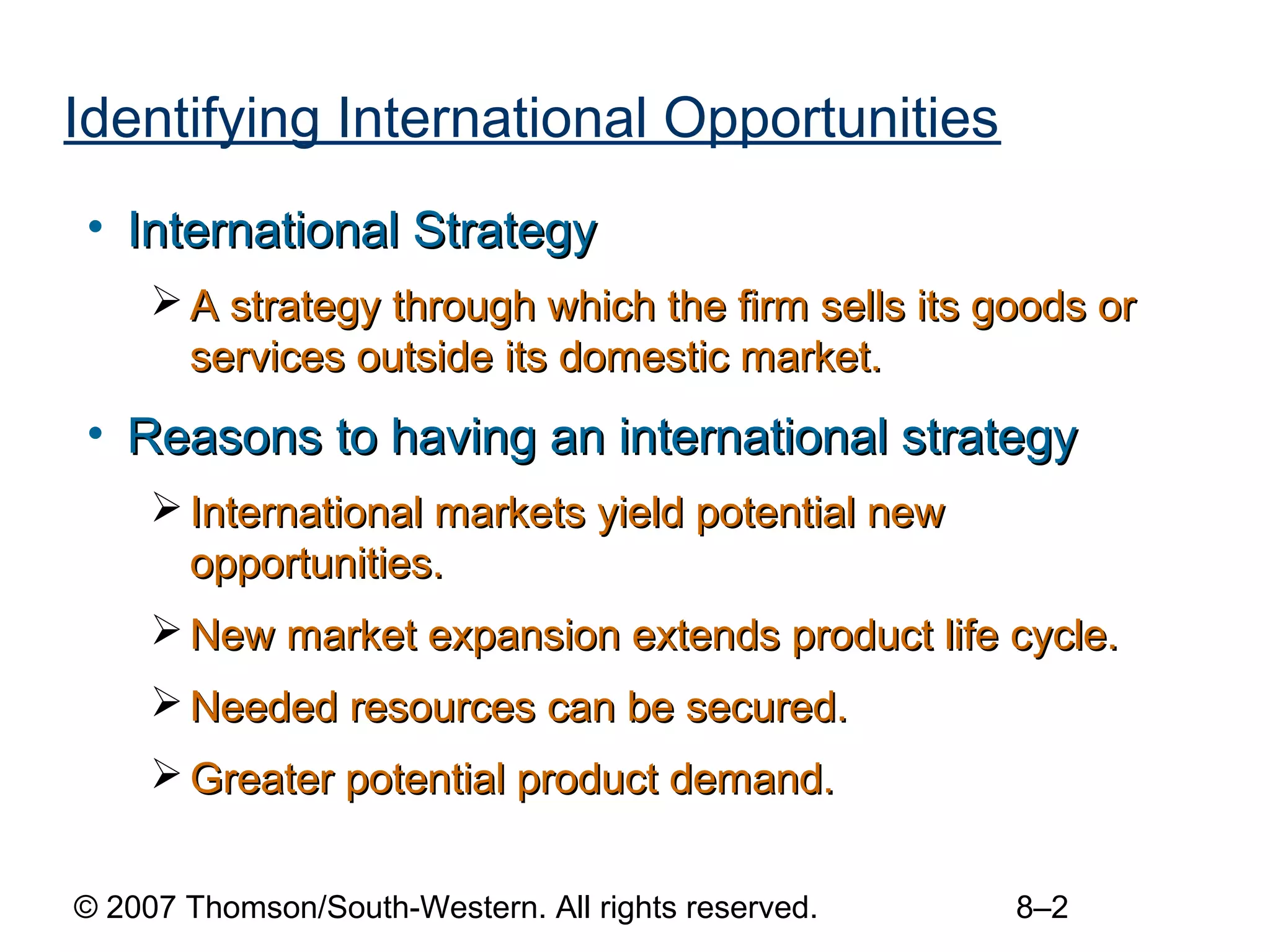 The document discusses international strategy and the rationale for pursuing international opportunities. It identifies several benefits of international strategy, including increased market size, return on investment, economies of scale, and access to location advantages. However, it also notes the complexity of managing multinational firms and risks in the international environment like political and economic risks. Managing the costs of coordination across diverse business units can also pose limits to international expansion.