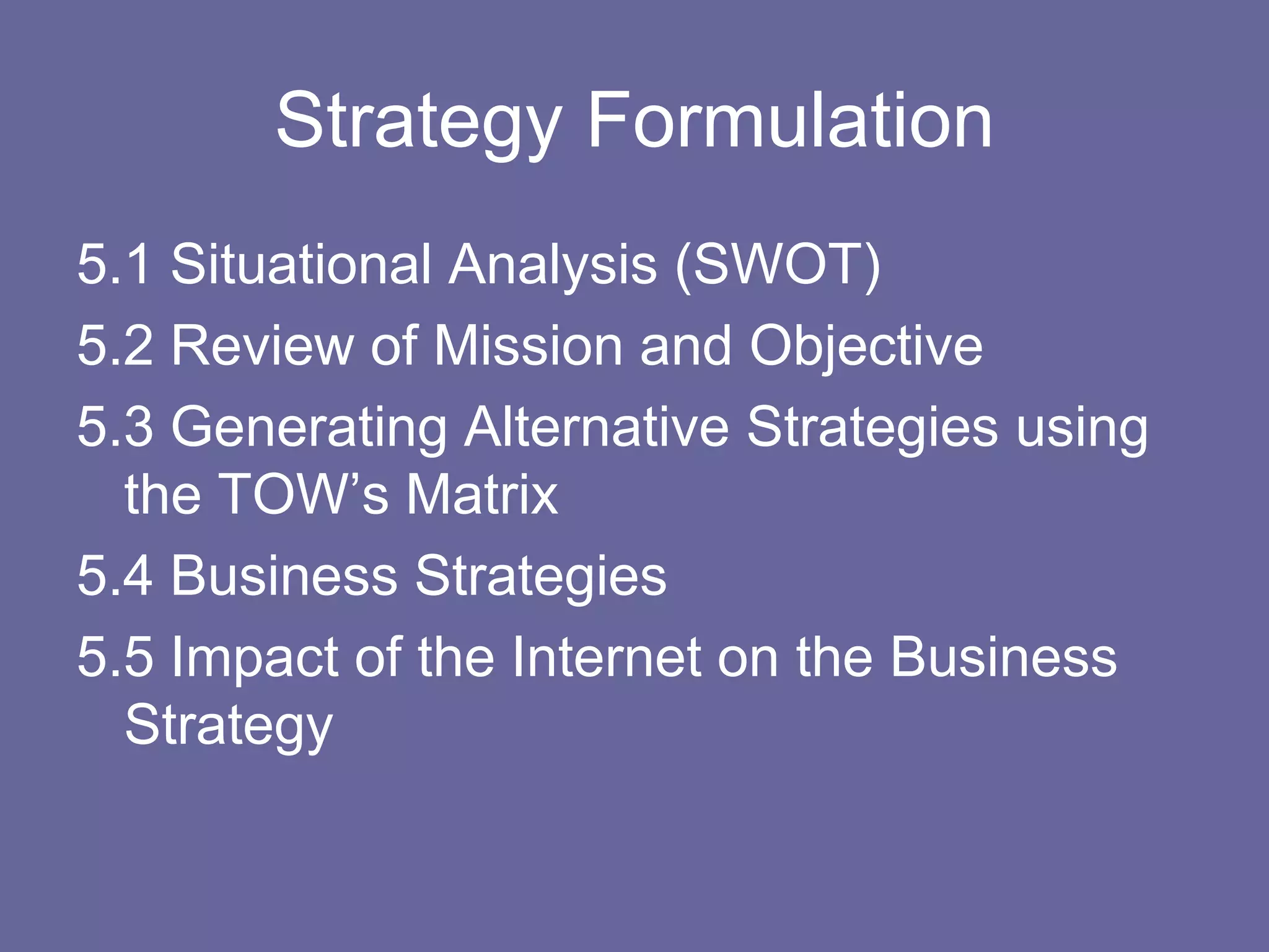 The document discusses corporate planning strategies including situational analysis (SWOT), reviewing mission and objectives, generating alternative strategies using the TOWS matrix, and business strategies. It provides details on SWOT analysis including its structure and uses. It also explains the TOWS matrix for identifying strategic options by analyzing strengths, weaknesses, opportunities, and threats. Finally, it discusses reviewing mission and objectives, different types of business strategies, and the impact of the internet on business strategy such as expanded communication capabilities and new competitors.