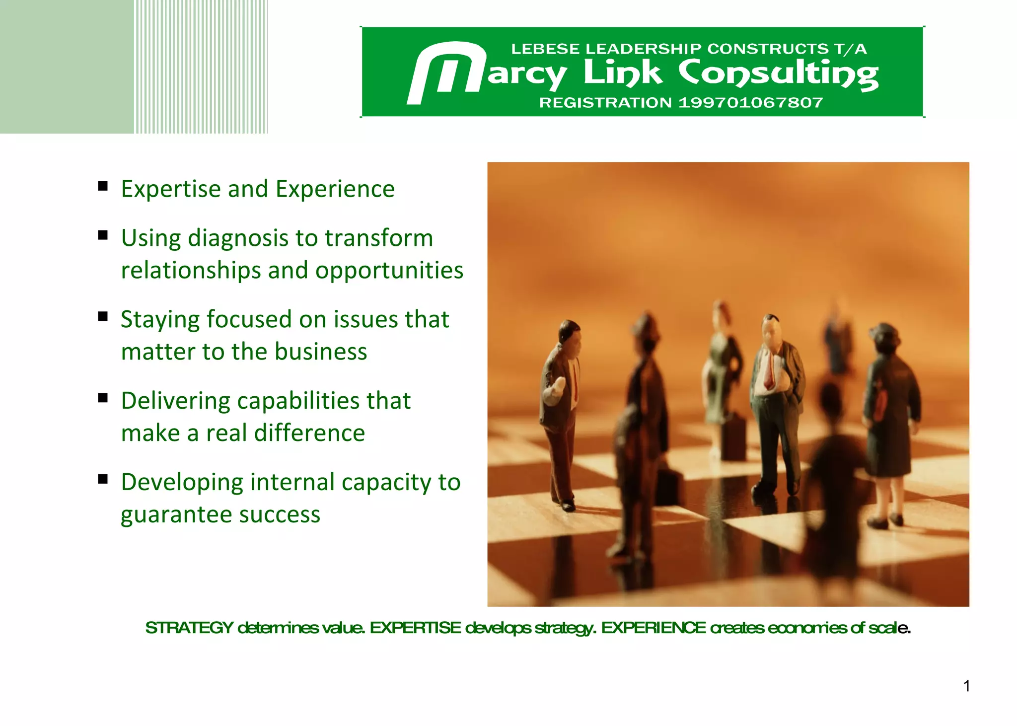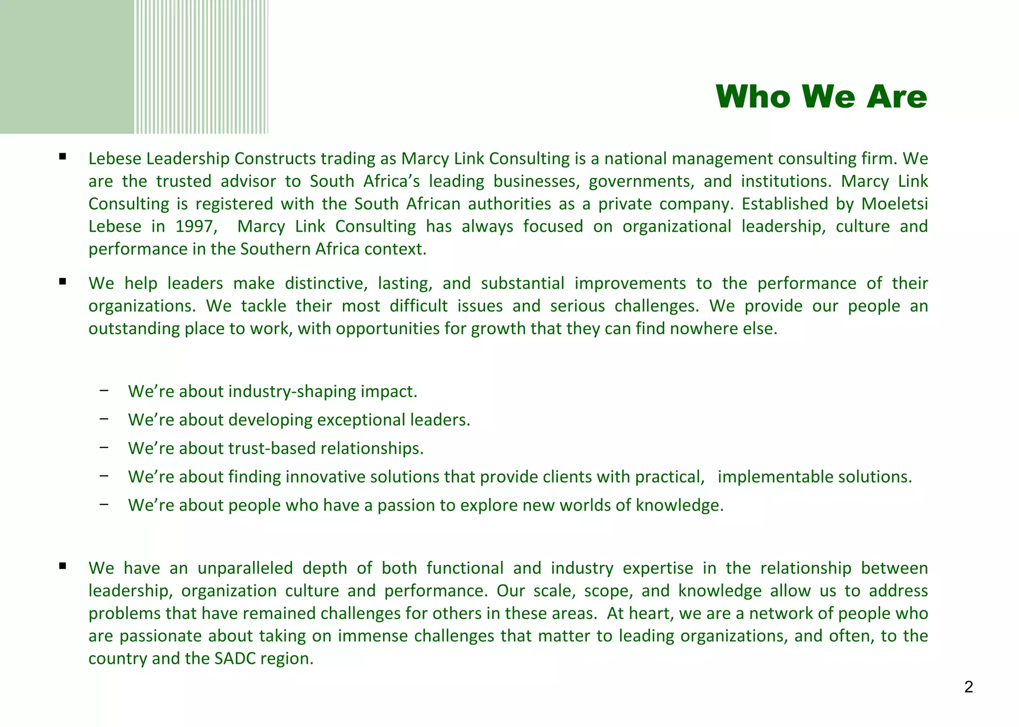 Marcy Link Consulting is a South African management consulting firm established in 1997 specializing in organizational leadership, culture, strategy development, and performance improvement. They work with leading businesses, governments, and institutions to tackle difficult issues and make lasting improvements. Their approach focuses on building strong relationships and developing clients' internal capabilities to ensure sustainable solutions.