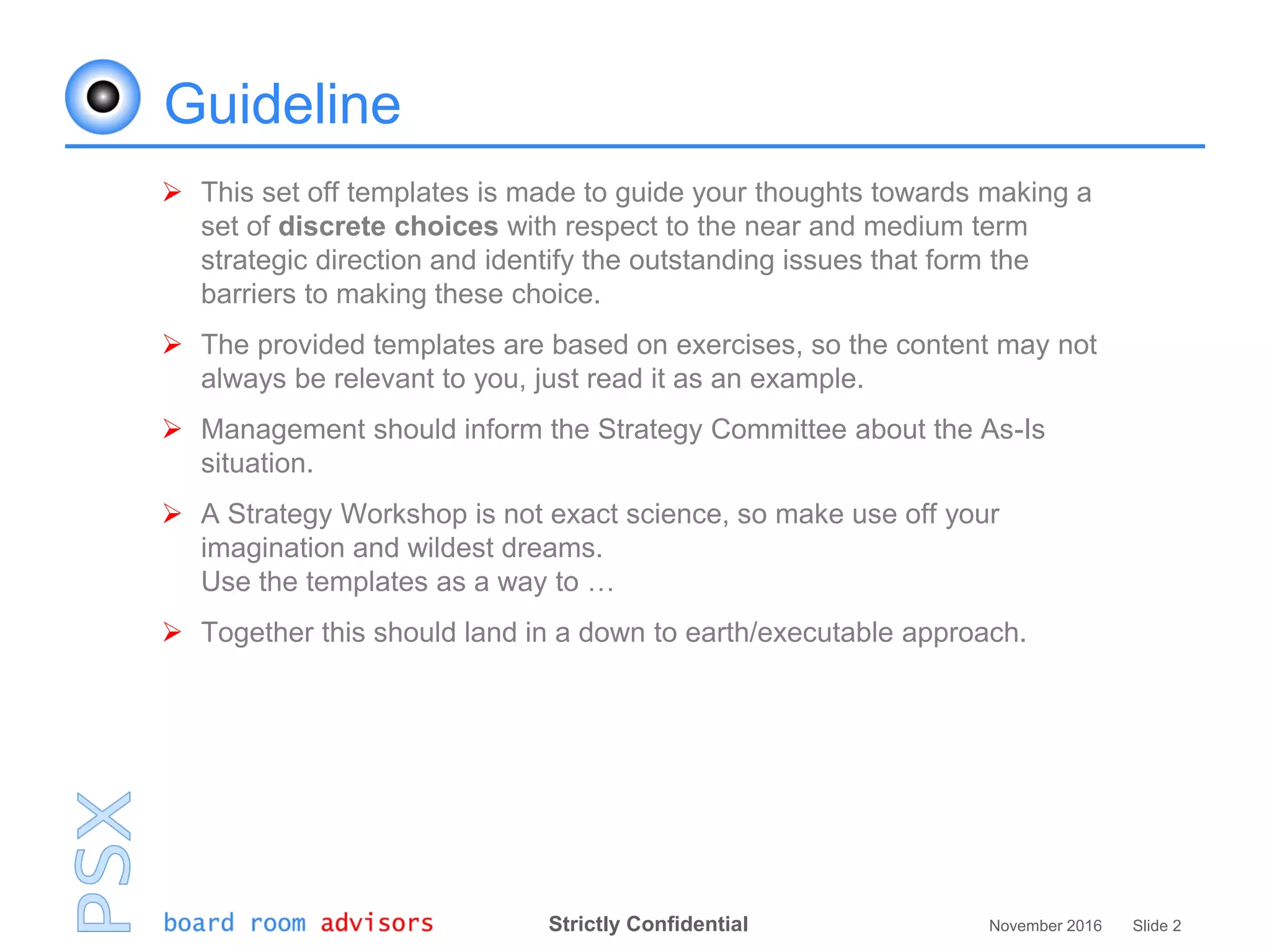 This document provides templates and guidelines for developing a strategic plan. It begins by outlining the strategic planning process, including defining goals and aspirations, assessing the current situation, analyzing the market and scenarios, evaluating options, and choosing a strategy. It emphasizes that strategy requires making tough choices to position the company for sustainable competitive advantage. The templates are meant to guide strategic thinking and discussions around key questions, opportunities, challenges and how to develop a robust strategy to create shareholder value.