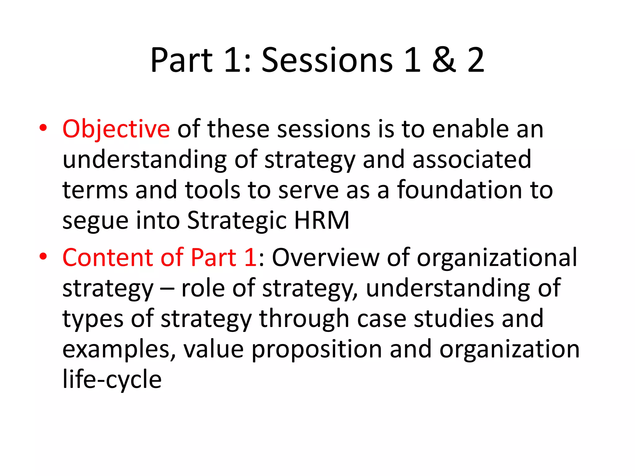 The document provides an overview of Part 1 of a session on strategy in strategic human resource management. Part 1 aims to provide an understanding of organizational strategy, including the role of strategy, different types of strategy, value propositions, and organizational lifecycles. It discusses key strategy concepts and tools such as Porter's five forces analysis and the generic business strategies of cost leadership, differentiation, and focus. Examples are provided of companies like Walmart, Krispy Kreme, and Kodak to illustrate different strategic approaches. The document emphasizes aligning HR practices with business strategy to achieve organizational goals.