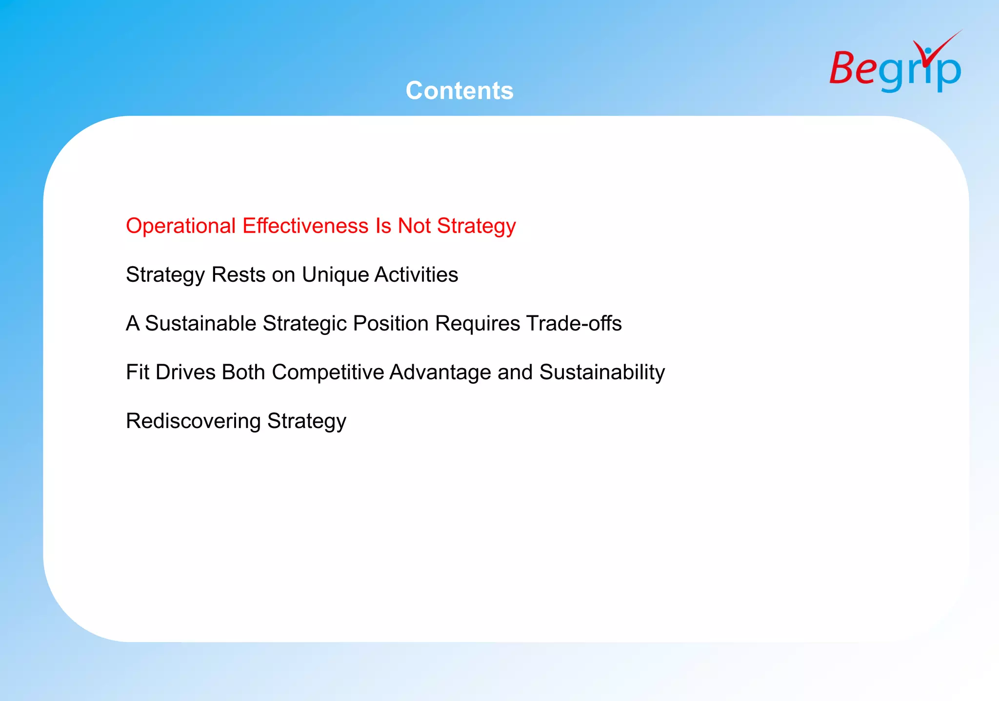 Operational effectiveness focuses on performing similar activities better than competitors through techniques like total quality management, benchmarking, and outsourcing. While necessary, operational effectiveness alone is not a strategy because competitors can quickly imitate these practices, resulting in zero-sum competition where all major players offer identical products and services. A strategy requires choosing unique activities to deliver unmatched value to customers. It defines a distinct position and requires trade-offs, focusing on fit rather than flexibility. Leaders must distinguish operational effectiveness, which demands constant change, from strategic decision-making that establishes a unique position with discipline and continuity.