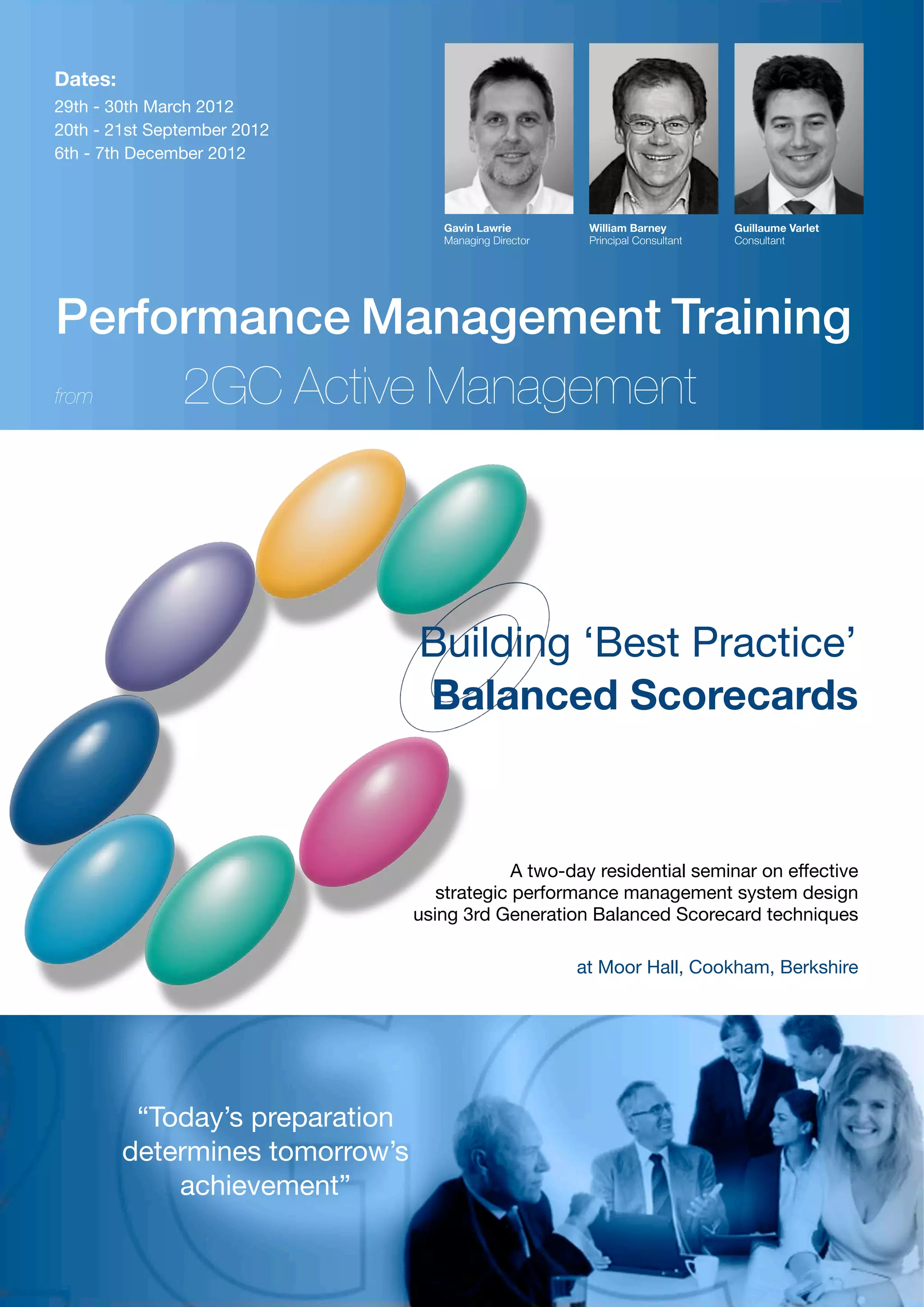 This document presents a two-day residential seminar on effective strategic performance management design using 3rd generation balanced scorecard techniques, facilitated by 2gc consultants. The course aims to enhance understanding of performance management, provide practical tips, and develop skills in balanced scorecard design, with opportunities to interact with experts in the field. Participants will gain access to course materials, and the seminar includes discussions, practical exercises, and insights into implementation challenges.