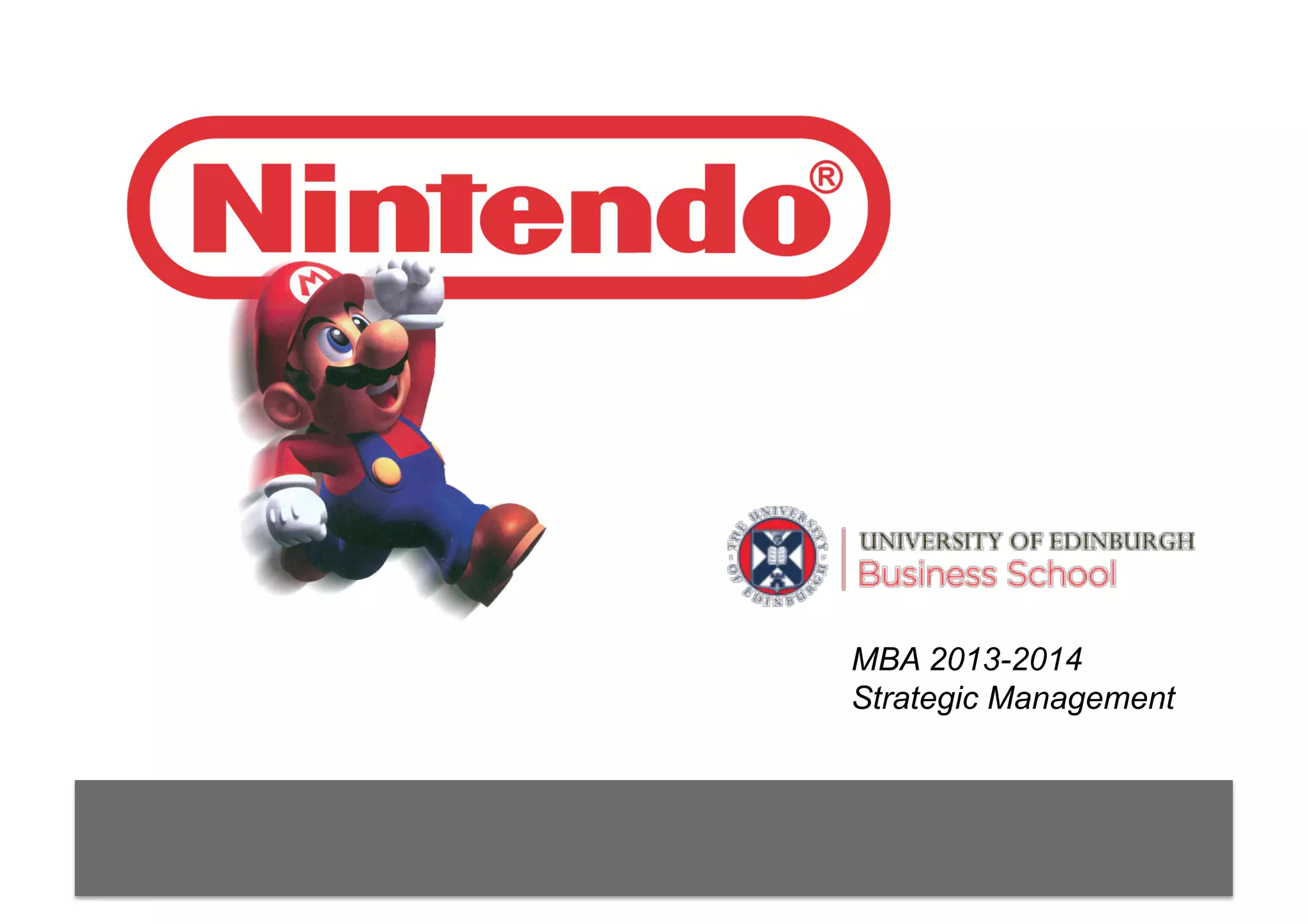 Nintendo is facing challenges maintaining market share with the Wii U not meeting sales expectations. The document proposes short and long term strategic options. In the short term, Nintendo could develop an online gaming console and partnerships. Long term, it could diversify into interactive learning and health games by building on successes like Wii Fit and leveraging R&D, talent, and distribution. The recommendation is to address competition short term while building a new "blue ocean" strategy long term moving gaming into education and healthcare.
