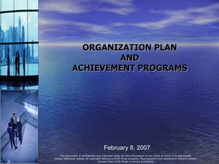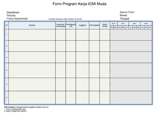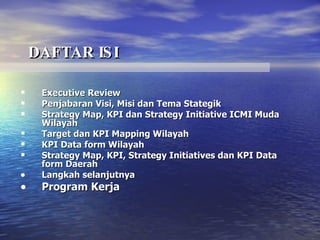 Dokumen ini merupakan rencana organisasi dan program pencapaian ICMI Muda yang memaparkan visi, misi, serta langkah strategis dalam meningkatkan kualitas keimanan dan ketaqwaan. Terdapat fokus pengukuran kinerja berdasarkan empat perspektif serta inisiatif strategi yang harus diperhatikan oleh pimpinan wilayah, dengan tujuan utama menciptakan pertumbuhan organisasi yang dinamis dan cerdas. Rencana ini diharapkan dapat disempurnakan agar mencapai kinerja optimal melalui kolaborasi dan partisipasi aktif anggota.