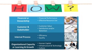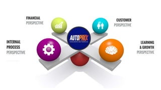 This document outlines a strategic plan for implementing a balanced scorecard at Autoprix, an automotive service center. The balanced scorecard will help Autoprix achieve its vision of being a leading company in its sector by satisfying customer needs, providing quality service, and increasing sales by 30%. An action plan divides tasks for designing and presenting the balanced scorecard approach among group members with a deadline of July 17, 2019. Questions are also provided to help evaluate how well the balanced scorecard improves Autoprix's strategic competitiveness, sales growth, customer complaints, employee training, quality, and decision-making.