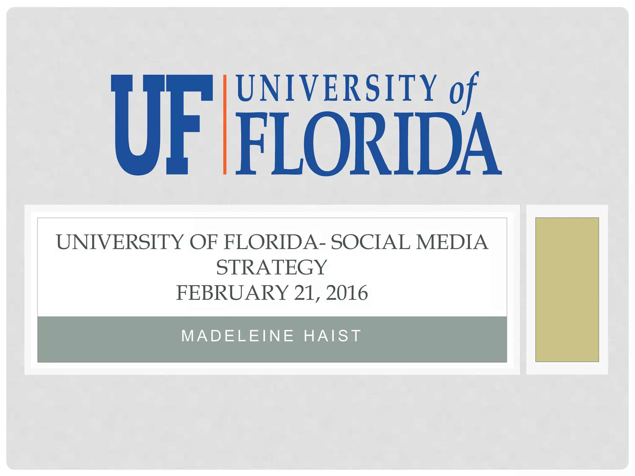 This document provides a social media strategy for the University of Florida. It includes an audit of current accounts, objectives to increase engagement and followers, guidelines for brand voice and persona, and a plan for content creation, measurement and critical incident response. The primary goals are to increase awareness of the university and create an inviting online presence through engaging posts on platforms like Facebook, Twitter and Instagram.