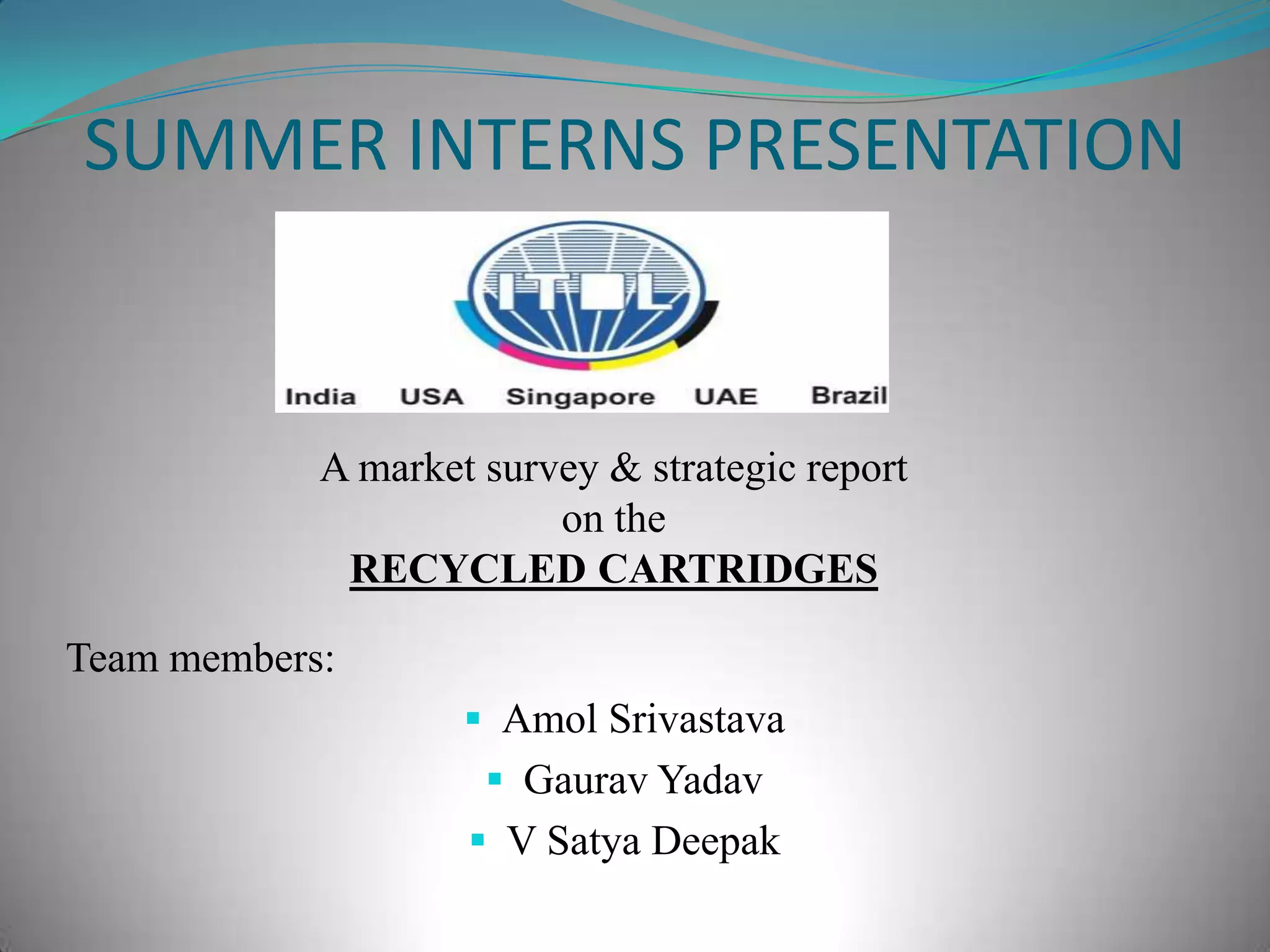 This document summarizes a presentation by summer interns on the market for recycled cartridges. The interns conducted surveys of colleges in Delhi to analyze cartridge usage and market potential. They found that HP dominates the printer market and most colleges refill cartridges monthly. The interns recommend focusing on the colleges identified as prospects, negotiating competitive refill prices, and providing strong technical support to promote recycled cartridges. Their analysis indicates opportunities in the institutional market for a company to establish itself as a leader in recycled cartridges.