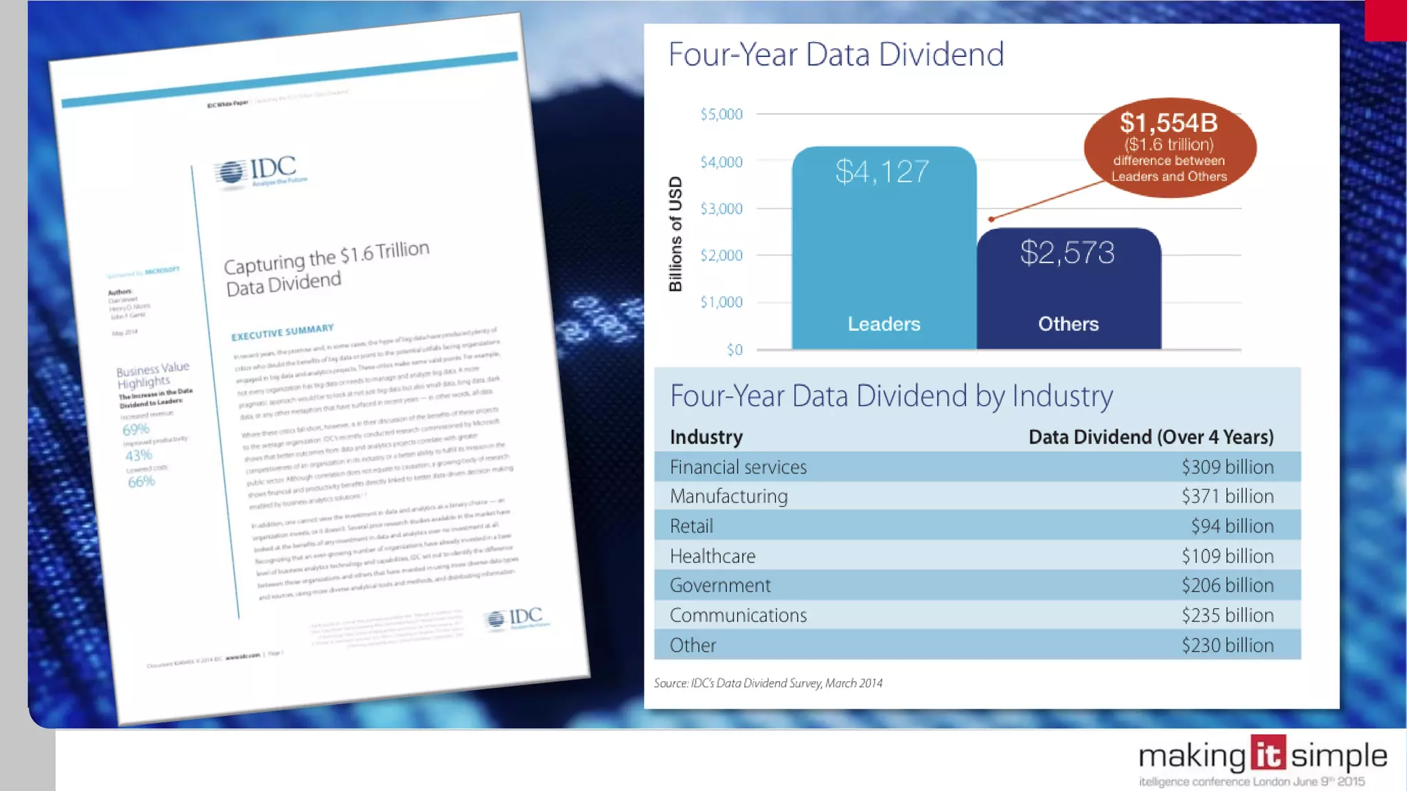 The document discusses how businesses can leverage analytics to tap into the £53 billion data dividend in the UK, emphasizing the importance of diverse data sources and modern technologies. It highlights the integration of various data management and business intelligence tools, particularly SAP's offerings, to enhance decision-making processes. Additionally, it encourages organizations to embrace advanced analytics for better insights and increased data utilization across all levels of the workforce.