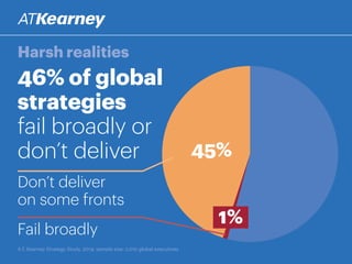 The A.T. Kearney 2014 strategy study reveals that 46% of global strategies fail or do not deliver, with 62% of executives stating that strategy development has become more challenging over the past decade. Increased participation from diverse executives is linked to greater success, though the study highlights a concerning gap between strategy formulation and deployment. Additionally, while agility is deemed increasingly important, successful strategies often arise from a balance between agility and traditional strategy planning.