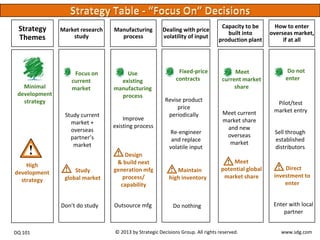 The high development strategy aims to greatly increase market share globally through next-generation manufacturing and new market entry. It focuses investment on known products but entails higher risks, exposure to losses, and potential disruption if expansion falters. Gains could generate more capital long-term but with less initial capital for the other division.