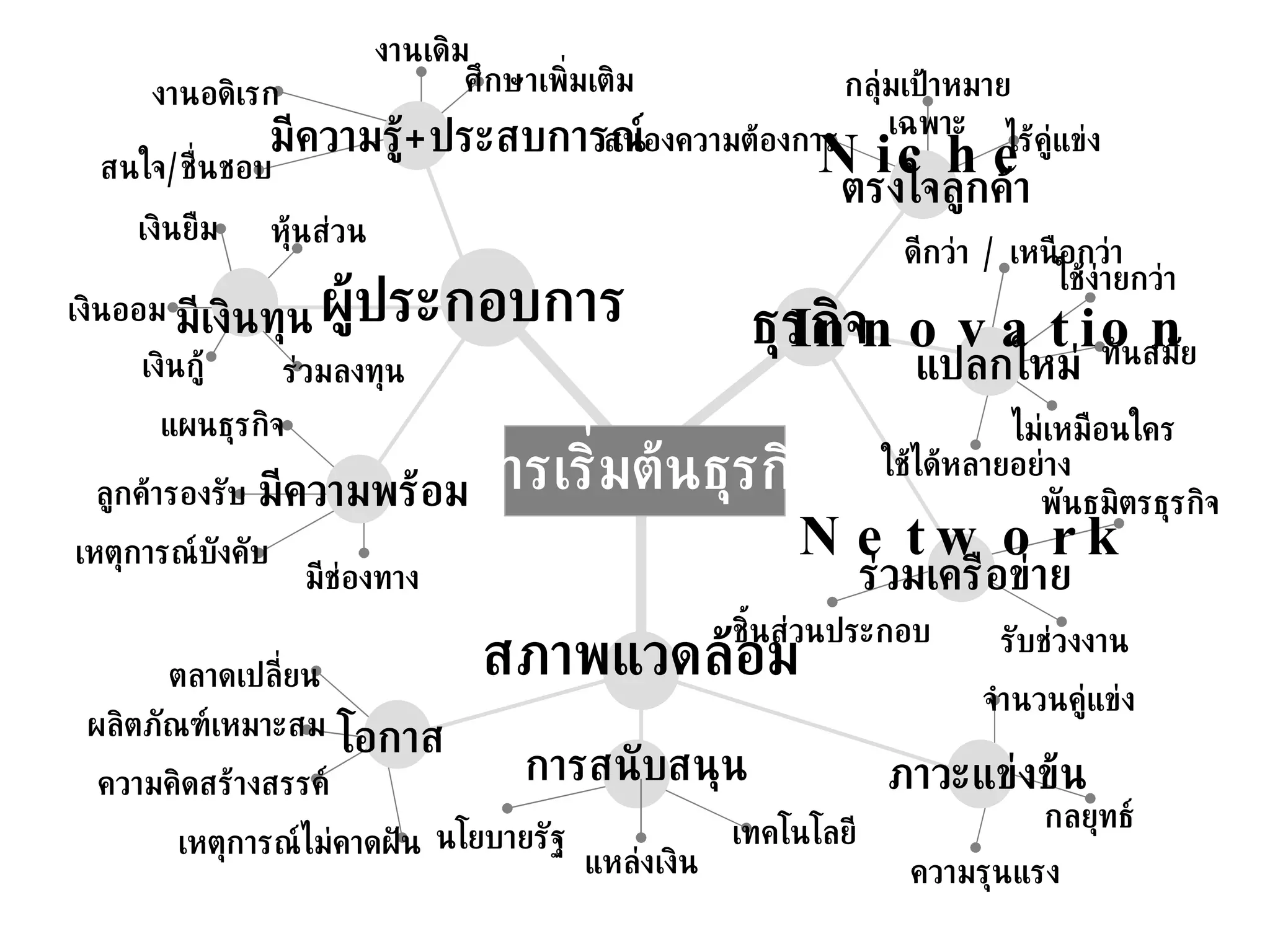 มีเงินทุน ความคิดสร้างสรรค์ ตลาดเปลี่ยนผลิตภัณฑ์เหมาะสม เหตุการณ์ไม่คาดฝัน จำนวนคู่แข่ง กลยุทธ์ ความรุนแรง แหล่งเงิน นโยบายรัฐ เทคโนโลยี โอกาส การสนับสนุน ภาวะแข่งข้น สภาพแวดล้อม พันธมิตรธุรกิจ รับช่วงงาน ชิ้นส่วนประกอบ ดีกว่า / เหนือกว่า ใช้ได้หลายอย่าง ไม่เหมือนใคร ใช้ง่ายกว่า ทันสมัย กลุ่มเป้าหมายเฉพาะ สนองความต้องการ ไร้คู่แข่ง Innovation Niche แปลกใหม่ Network ร่วมเครือข่าย ธุรกิจ ตรงใจลูกค้า เงินออม เงินยืม เงินกู้ ร่วมลงทุน หุ้นส่วน แผนธุรกิจ ลูกค้ารองรับ มีช่องทาง เหตุการณ์บังคับ งานอดิเรก ศึกษาเพิ่มเติม สนใจ / ชื่นชอบ งานเดิม มีความรู้ + ประสบการณ์ มีความพร้อม การเริ่มต้นธุรกิจ ผู้ประกอบการ - 3.
