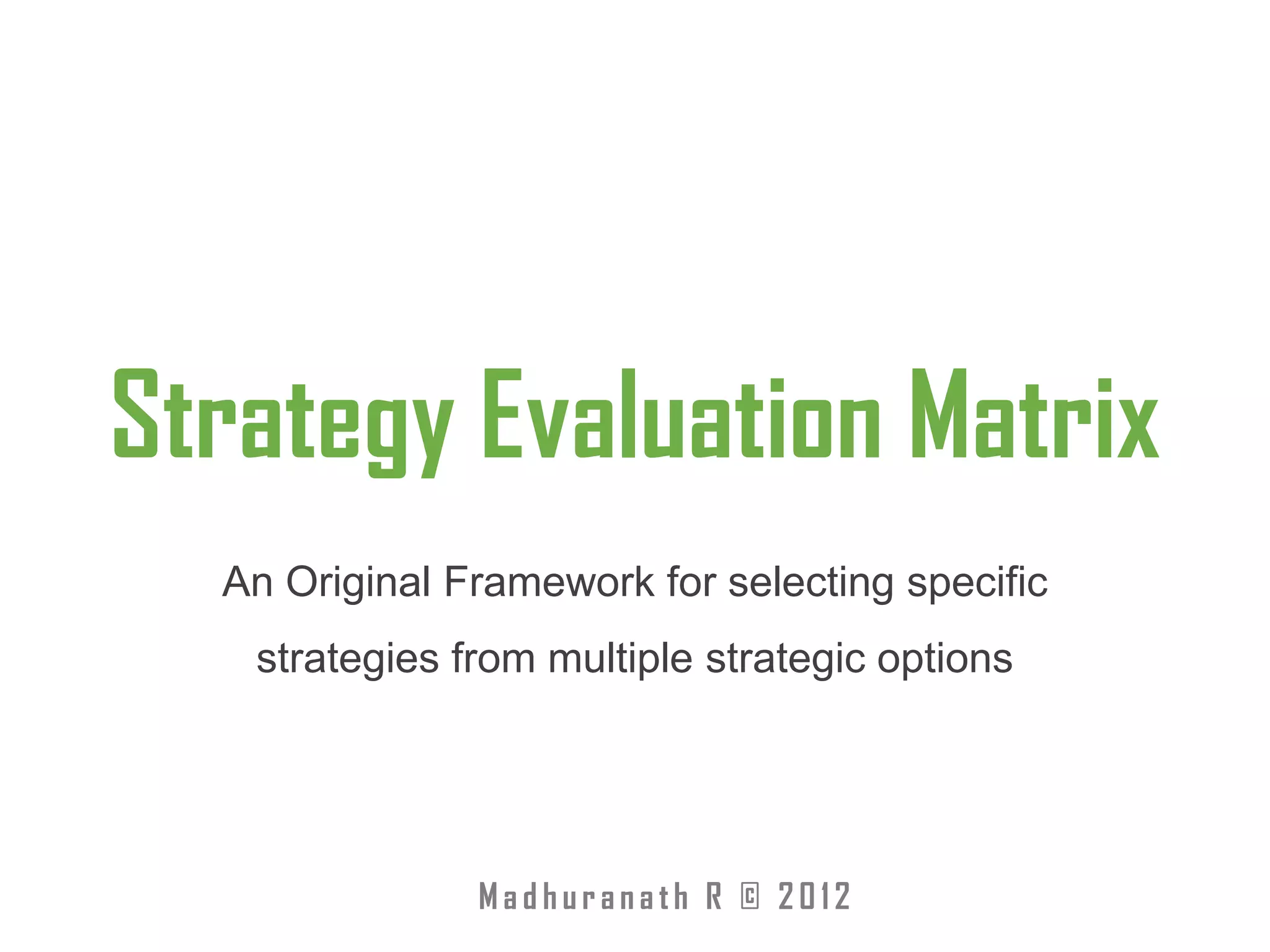 This document introduces the Strategy Evaluation Matrix (SEM), an original framework for selecting strategies from multiple strategic options. The SEM evaluates strategies based on their risk level and ability to execute. It maps strategies to four quadrants: avoid, investigate, delay, and execute. The framework recommends selecting strategies in the "execute" quadrant as they require low risk and high ability to execute, yielding maximum value. The SEM can be used in strategy planning to evaluate options generated from a SWOT analysis, and is generally applicable to idea filtering, marketing campaigns, and product development.