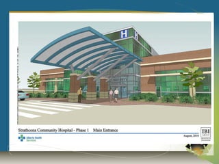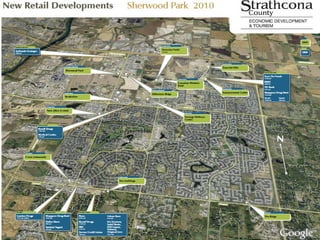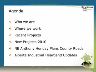 The document provides an update on Strathcona County, Alberta. It discusses population growth, housing prices, building permits issued, and major development projects. It also outlines upcoming infrastructure projects like the new community center and hospital. Several industrial projects in the Alberta Industrial Heartland are mentioned, including expansions of the Shell Scotford Upgrader and Total E&P Canada Upgrader. The document concludes with economic indicators and an invitation for further information from the economic development department.