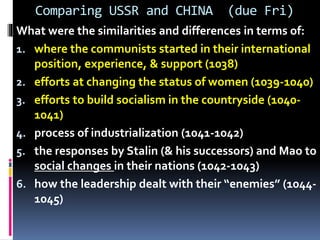 This document outlines 6 topics to compare the USSR and China in their early communist periods: 1) international position and support starting in 1938, 2) efforts to change the status of women, 3) efforts to build socialism in rural areas, 4) industrialization processes, 5) responses to social changes by Stalin/successors and Mao, and 6) how the leaderships dealt with enemies. The reader is assigned a comparison of these 6 aspects between the USSR and China to be completed by Friday.