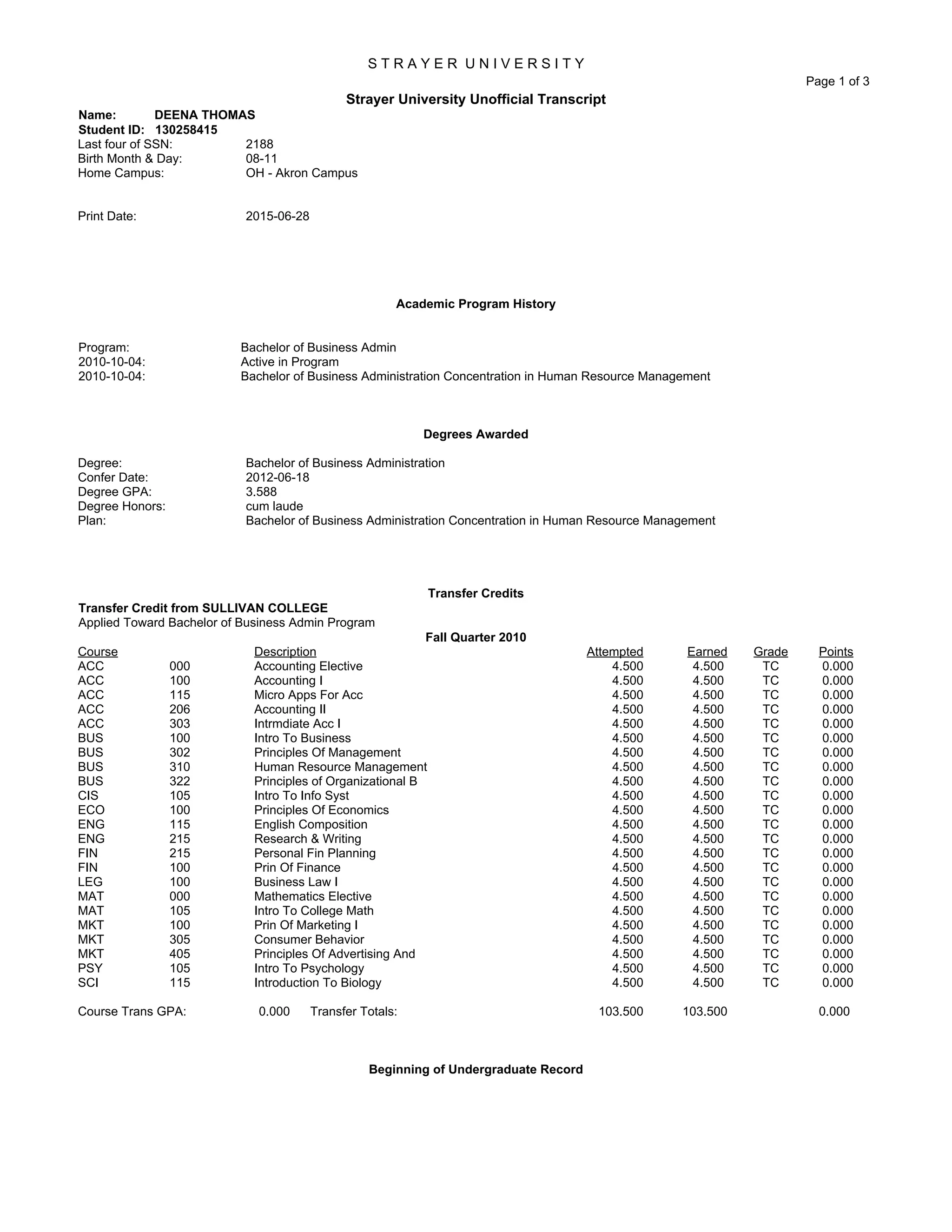 Deena Thomas received a Bachelor of Business Administration degree from Strayer University in 2012. She graduated cum laude with a GPA of 3.588. Her course of study was in the concentration of Human Resource Management. She transferred 103.5 credits from Sullivan College and completed the remaining coursework at Strayer University over 6 years, maintaining above a 3.5 GPA each term.