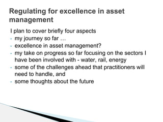 - The document discusses excellence in asset management, focusing on the author's experience in water, rail, and energy regulation.
