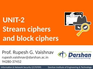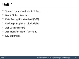 The document provides an overview of stream ciphers and block ciphers, detailing their structures and examples, such as DES and AES. It explains key concepts including diffusion and confusion, the Feistel cipher structure, and the operations involved in encryption and decryption processes. Additionally, the document outlines the AES structure, transformation functions, and the key expansion algorithm.