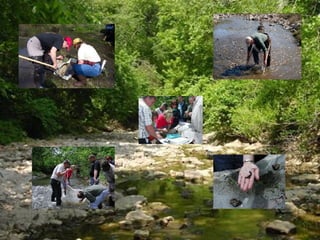 This document provides an overview of stream ecology, covering chemical, physical, and biological processes in running water ecosystems. It discusses that stream ecology is complex and involves interrelationships between organisms and their environment. The key processes discussed include the nutrient and chemical cycles, factors that influence physical properties at different spatial scales, primary producers and consumers in the food web, and how community interactions and ecosystem processes function. It also provides a brief introduction to macroinvertebrates, explaining their importance in the food chain and for assessing water quality based on their varying sensitivity to conditions.