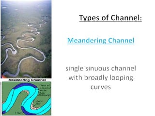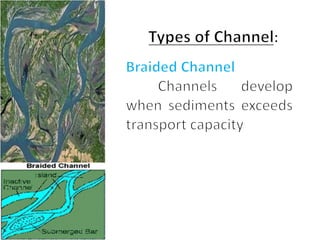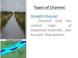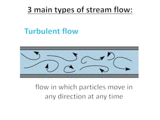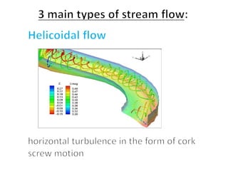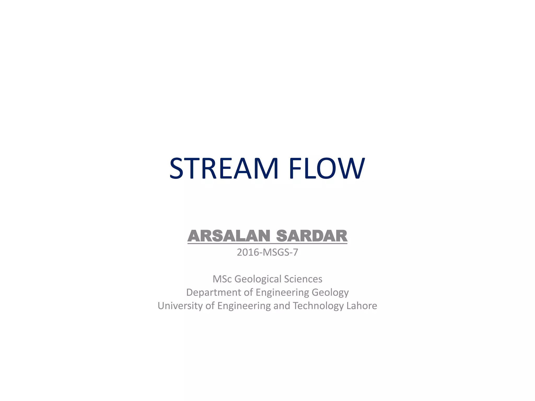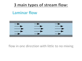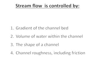 This document discusses streamflow, factors affecting streamflow quality, and methods of measuring streamflow quantity. It describes the three main mechanisms that generate streamflow: Hortonian overland flow, subsurface flow, and saturation overland flow. It also outlines common issues affecting streamflow quality and provides details on stage-discharge relationships, including guidelines for gauge location and types of gauges used to measure stream stage. Measurement of stream discharge is also briefly discussed.