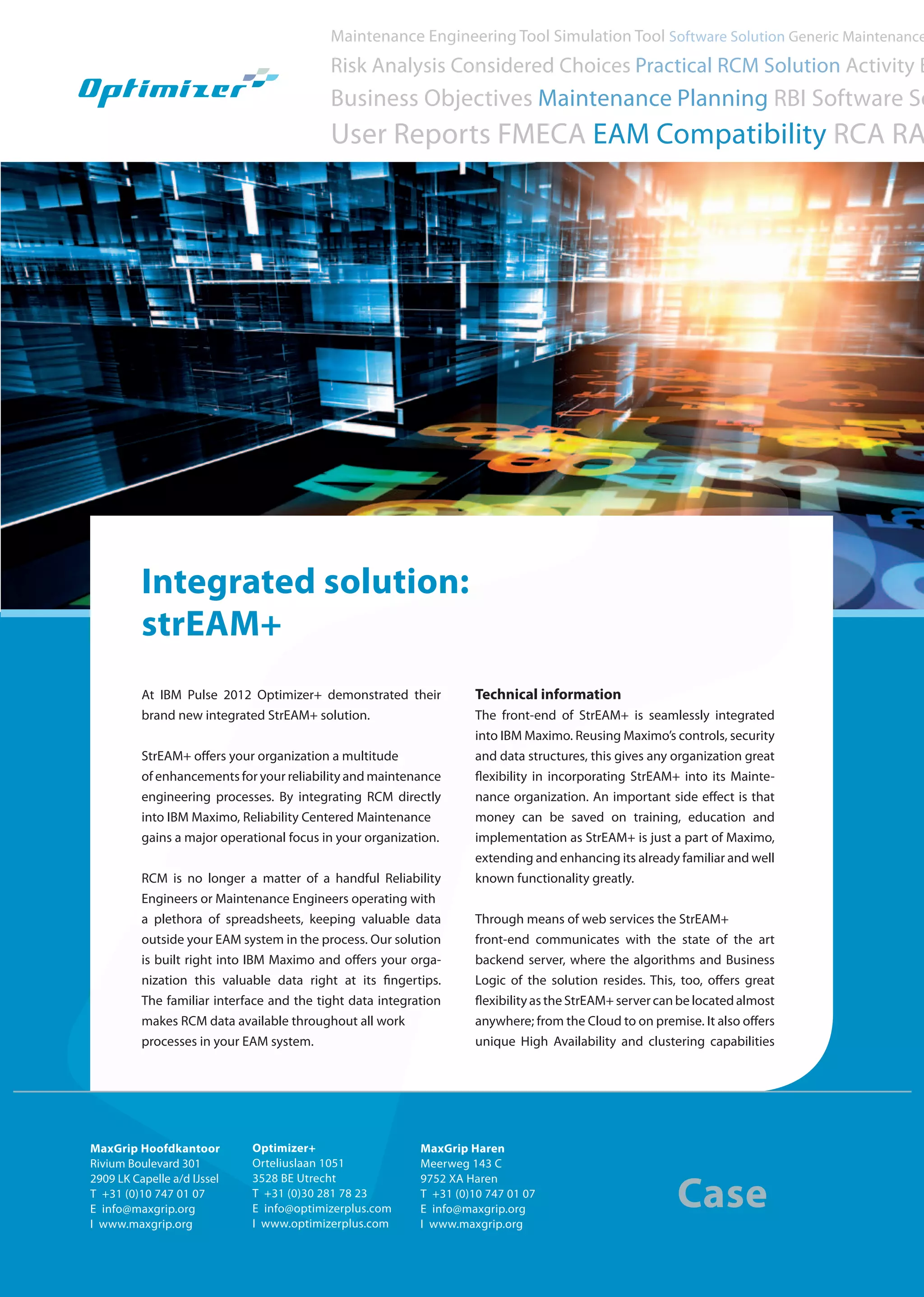The document describes the integrated maintenance engineering tool, Stream+, which enhances reliability centered maintenance (RCM) by integrating seamlessly with IBM Maximo. It offers flexibility, operational focus, and significant cost savings on training and implementation, while supporting industry standards for various sectors. Additionally, Stream+ allows organizations to make informed decisions about asset maintenance, improving process efficiency and reducing impact on workloads and budgets.