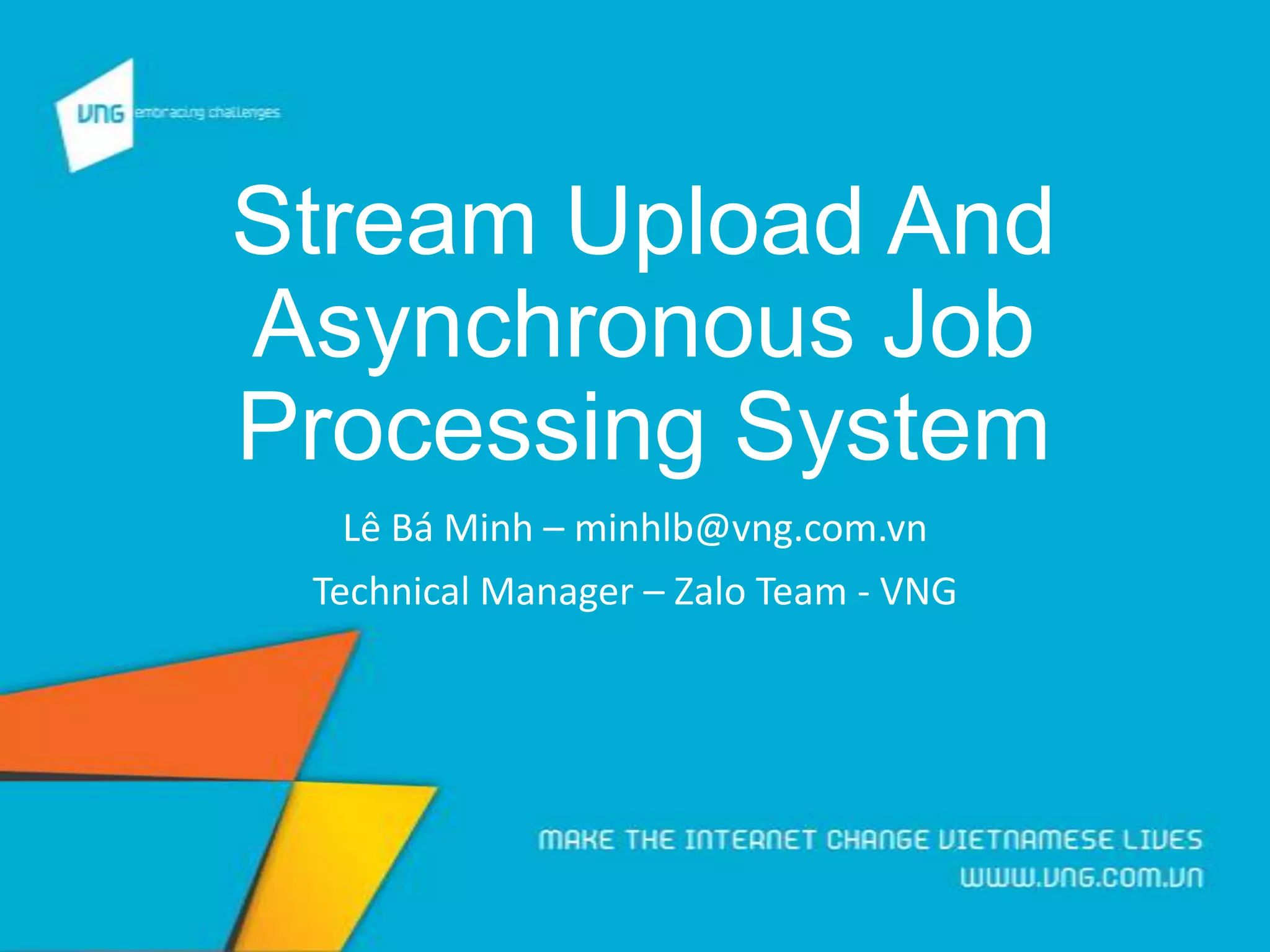 This document discusses an asynchronous job processing system developed by VNG for Zalo. It allows for parallel stream uploads and background processing of large amounts of data. The key points are:
