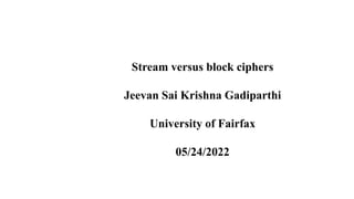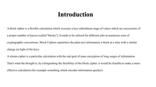 Block ciphers encrypt data in fixed-size blocks, while stream ciphers encrypt individual bits or bytes. Stream ciphers are generally faster than block ciphers but are more difficult to implement securely. Block ciphers are better for known data sizes like files, while stream ciphers are better for unknown or continuous data like network streams. The document discusses the advantages and disadvantages of stream and block ciphers, including that stream ciphers encrypt individually while block ciphers encrypt blocks, and that errors affect entire blocks for block ciphers but only individual pieces for stream ciphers.