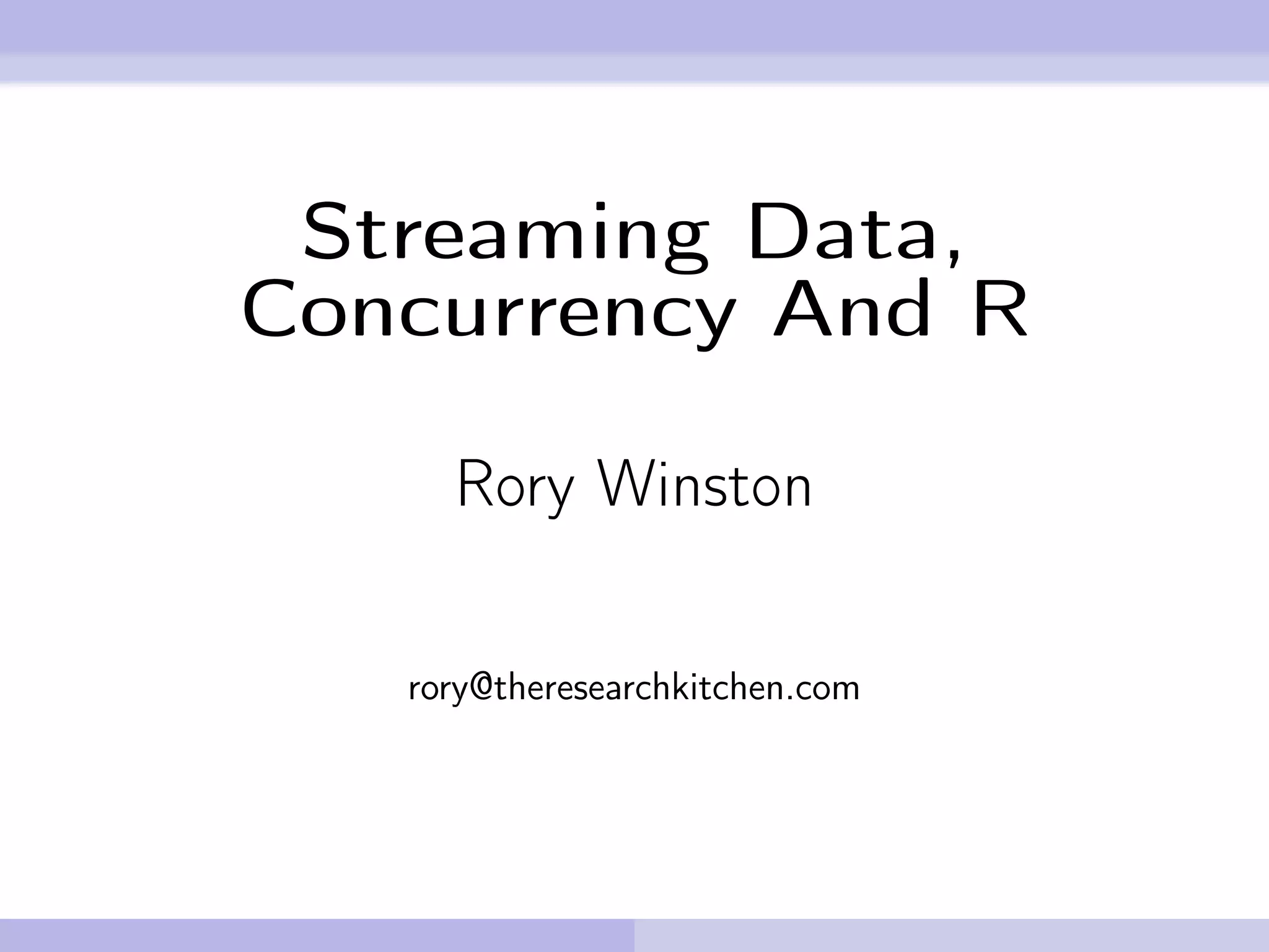 The document discusses the challenges and capabilities of R programming for streaming data analysis, emphasizing its single-threaded nature and limitations in direct concurrency. It highlights the advantages and disadvantages of R, referencing several tools and packages like 'bigmemory' and 'nws' that facilitate working with large datasets through inter-process communication. A proposed approach involves utilizing separate R processes for data subscription to enhance user experience and concurrency despite R's interpretation constraints.