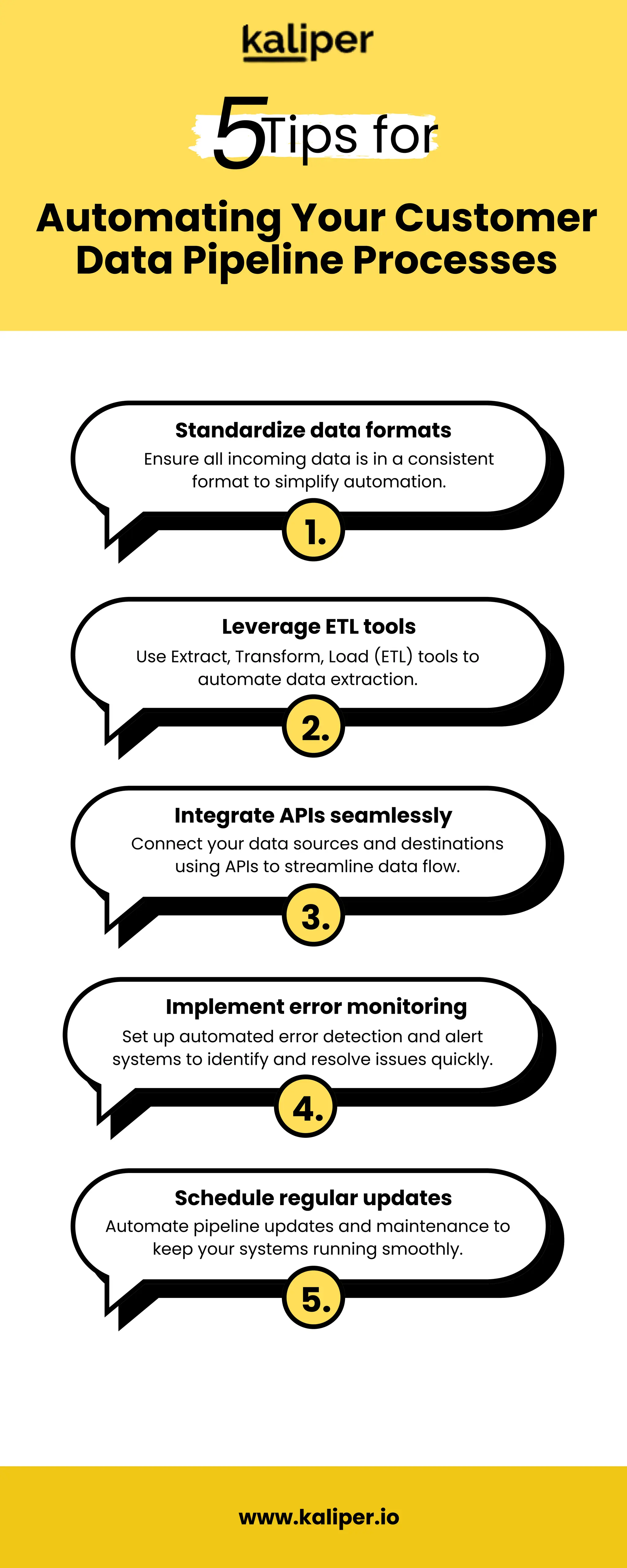 The document provides five tips for automating customer data pipeline processes: standardize data formats, leverage ETL tools, integrate APIs, implement error monitoring, and schedule regular updates. These strategies aim to enhance data consistency, streamline workflow, and ensure quick issue resolution. By following these tips, organizations can maintain efficient and effective data management systems.