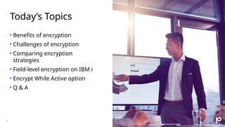 The document discusses the importance of data encryption for protecting sensitive information on IBM i systems, highlighting benefits such as data protection, compliance, and maintaining brand reputation. It compares different encryption strategies, including disk-level and field-level encryption, and introduces the 'encrypt while active' feature that minimizes downtime during encryption processes. Additionally, it addresses challenges such as key management and application risks associated with encryption implementation.