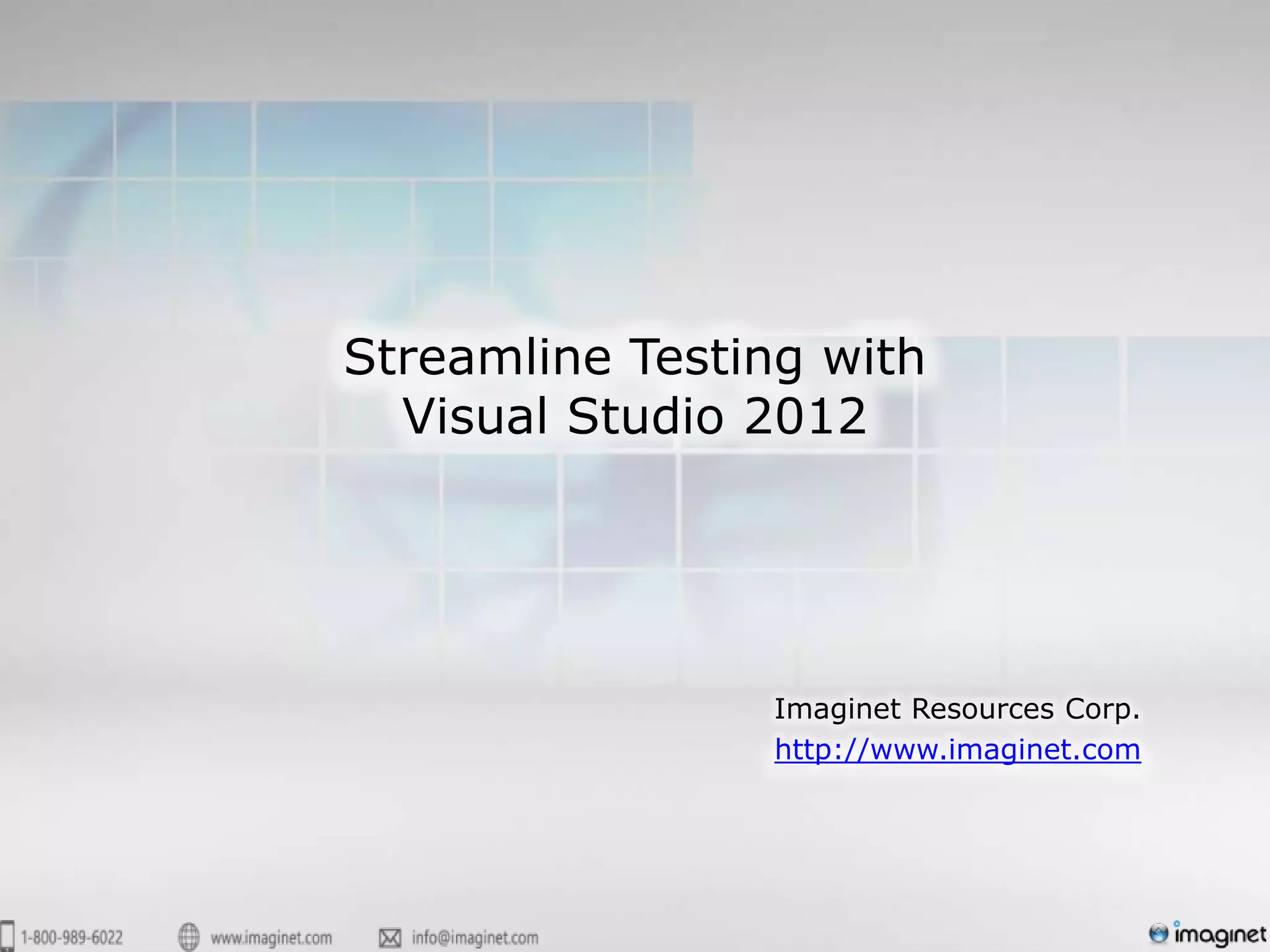 The document outlines software quality assurance practices and opportunities to streamline QA processes using Visual Studio 2012. It emphasizes the importance of early tester involvement, automation of build and test environments, and effective bug tracking to enhance software testing efficiency. Additionally, it highlights tools such as Microsoft Test Manager and Visual Studio for managing test planning, execution, and quality metrics.