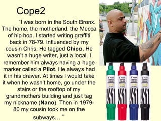 The artist Cope2 was born in the South Bronx, the birthplace of hip hop culture. He was introduced to graffiti in the late 1970s by his cousin Chris, who tagged under the name "Chico." Cope2 would practice tagging his nickname "Nano" in isolated areas. In 1979-1980, his cousin took him on subway trains to tag the interiors, exposing him to the tags of other prolific writers from that era. Seeing these large, elaborate tags on the outsides of subway cars inspired Cope2 to get more seriously involved in graffiti.