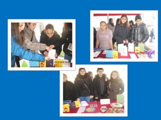 This document describes a school partnership project called "The Fairytale of the European (Golden) Future" that received funding from the European Commission. It discusses the Bulgarian team's annual charity and support activities for seniors around Christmas time in 2014. They held a street bazaar where students made and sold Christmas cards, and an auction where they cooked traditional Bulgarian dishes. The events raised money for socially weak students and provided food for local seniors.