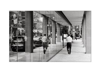 Street photography documents candid subjects and situations in public places. It can provide insight into society and capture poignant or ironic moments. While street photography has a long history, capturing strangers with cameras raises legal and ethical issues. The document provides tips for street photographers to blend in, avoid direct eye contact, and use available light to discreetly photograph the everyday lives and environments of others.
