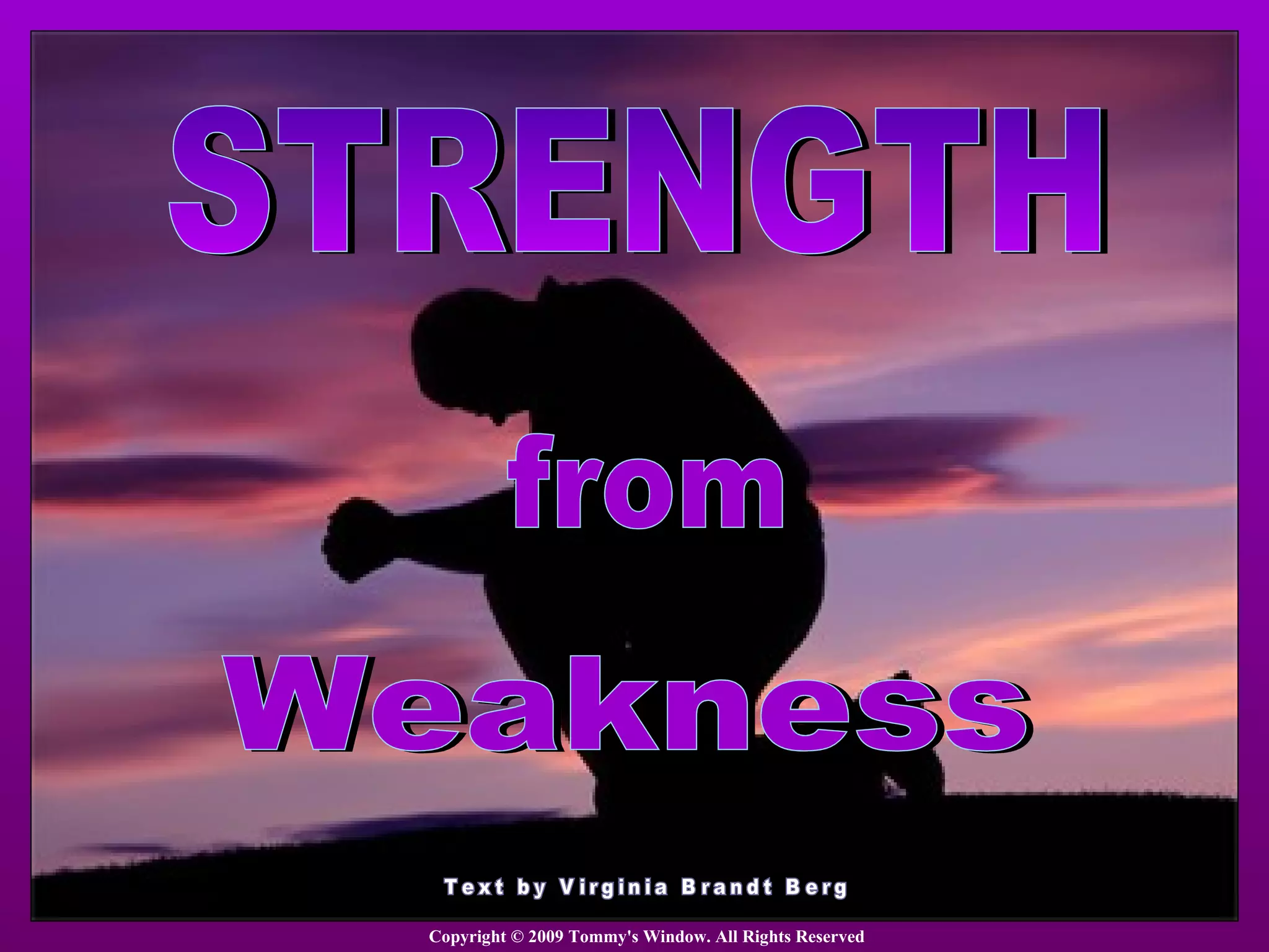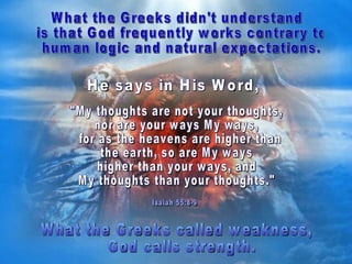 This document discusses relying on God's strength rather than human strength. It notes that God is able to do the most through people who recognize their own weakness and depend fully on divine strength. Examples are given of Moses, Jesus' disciples, and the author's daughter, who had to learn to depend on her father rather than try to walk independently. The conclusion encourages the reader to ask God for wisdom and strength rather than relying on their own abilities.