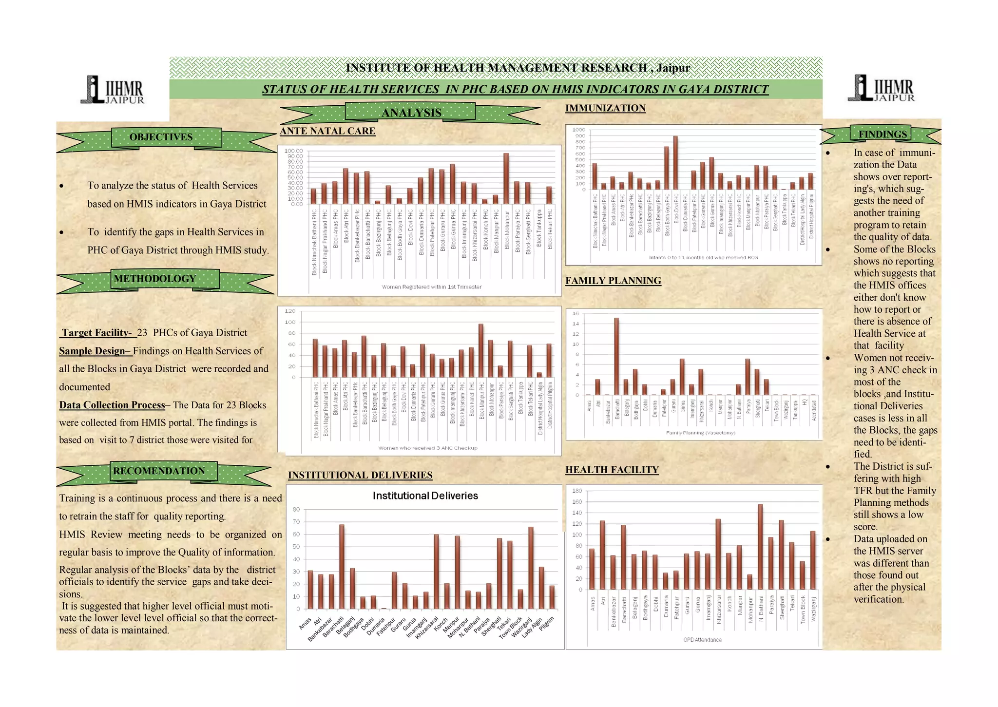 The document analyzes health services in Gaya District, India based on HMIS indicators. It collected data from 23 PHCs in the district's blocks to identify gaps in health services. Key findings include low rates of antenatal care, institutional deliveries, and family planning compared to the district's high birth rate. Some blocks showed no reporting or over-reporting of immunizations. Data uploaded to the HMIS system differed from physical verifications. Recommendations include retraining staff on quality reporting, regular HMIS review meetings, analyzing block data to identify gaps, and motivating officials to maintain correct data.