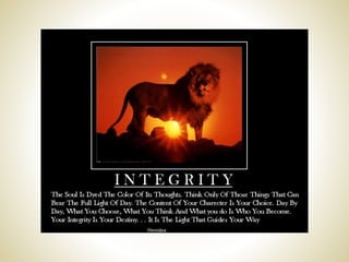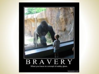 The document discusses four strengths of courage: bravery, persistence, integrity, and vitality. Bravery involves acting on convictions even if unpopular. Persistence is continuing goal-directed action despite obstacles. Integrity means being true to oneself and taking responsibility for one's actions and feelings. Vitality is approaching life with excitement and energy and feeling alive.
