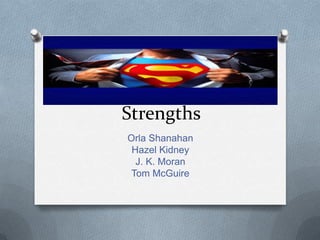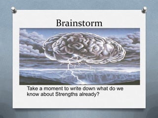 This document provides an overview of a seminar on character strengths. It defines character strengths as positive traits reflected in thoughts, feelings and behaviors. It outlines the main theorists in positive psychology, such as Seligman and Peterson. It discusses the history of positive psychology and lists the 24 character strengths organized under 6 virtues. The document also discusses how to apply character strengths in areas like education, sports, and politics and provides learning outcomes and suggested readings.