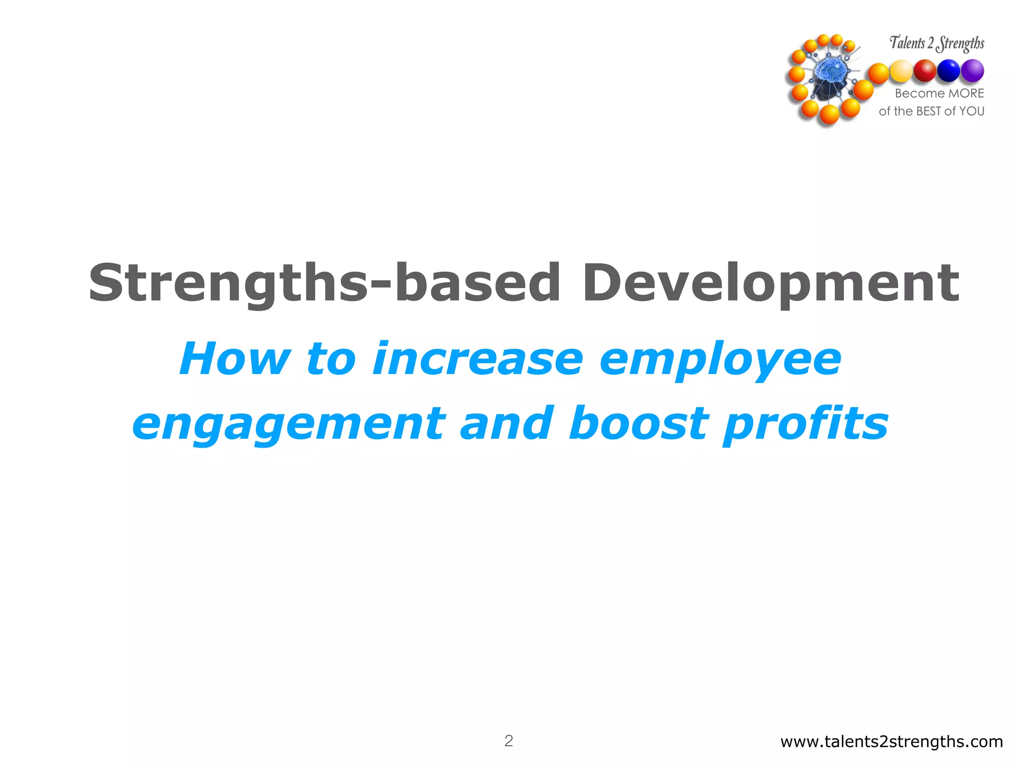 This document provides an overview of strengths-based development and how focusing on employee strengths can increase engagement and business results. It discusses Gallup's research on strengths which found that high achievers spend most of their time using their strengths. The Clifton StrengthsFinder assessment identifies 34 talent themes and individuals have a unique combination of top 5 themes. Strengths-based organizations focus on identifying, developing and utilizing individual and team strengths across the employee lifecycle to improve performance, engagement and retention.