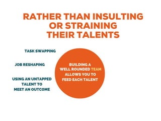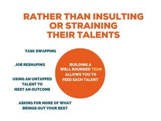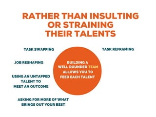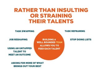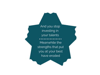 Strengthsfinder training emphasizes unlocking individual talents, leading to significant enhancements in capabilities, as evidenced by a study showing average readers increased speed by 66% and above-average readers by 828%. Focusing on personal strengths can improve career engagement, life quality, and overall job satisfaction. The document argues for the benefits of leveraging one's unique talents rather than concentrating on weaknesses for personal and professional growth.