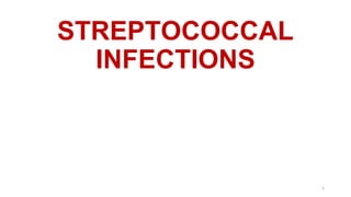 Streptococcal infections can be caused by a variety of Streptococcus bacteria. Streptococci are classified based on their hemolytic properties and Lancefield antigens. Identification requires examining gram stain morphology, hemolytic patterns, biochemical reactions, and genetic analysis. Pathogenic species like S. pyogenes and S. agalactiae can cause diseases ranging from pharyngitis to necrotizing fasciitis through direct invasion and toxin production. Diagnosis involves culture and identification of the isolated strain. Treatment focuses on appropriate antibiotic therapy.