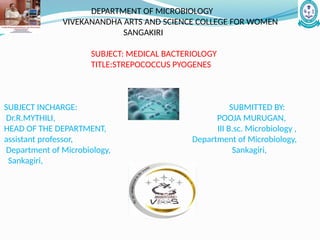 The document discusses Streptococcus pyogenes, highlighting its classification, morphology, cultural characteristics, pathogenicity, and diagnosis. It outlines the infections caused by this bacterium, including pyogenic and non-pyogenic diseases, along with their symptoms and treatments. Laboratory diagnosis methods are also presented, emphasizing the importance of specific tests for identifying infections and the recommended antibiotic therapies.