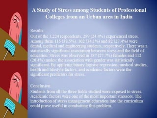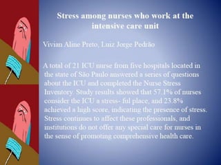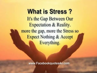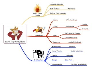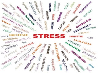 The document defines stress and models of the stress response. It discusses homeostasis and how the body tries to maintain equilibrium in response to stressors. Three main models of stress are described: stimulus-based (stress is a stimulus that causes physiological/psychological reactions), response-based (Selye's general adaptation syndrome of alarm, resistance, and exhaustion stages), and transactional (stress arises from person-environment interactions). Factors like genetics and development stage influence individual stress tolerance. Nursing management of stress involves identifying stressors and helping patients strengthen healthy coping responses.