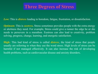 Stress is the combination of psychological, physiological and behavioral responses to perceived threats or challenges in the environment. There are three levels of stress: low stress which can lead to boredom or frustration, optimal stress which provides energy for tasks, and high stress which is distressing and can negatively impact health. The body's response to stress follows a three stage process of alarm, resistance and exhaustion. Sources of stress include daily hassles, major life events and catastrophes. Stress responses include psychological, physiological and behavioral reactions in the body and mind. Chronic stress can lead to burnout which involves worsening psychological, physical and behavioral dysfunction over time if not managed effectively.
