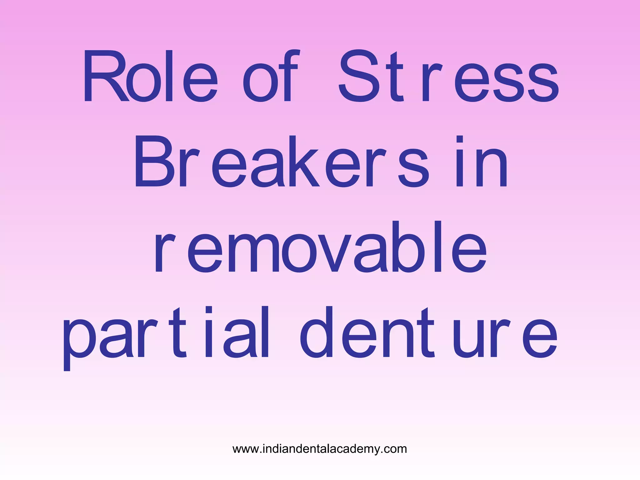 This document discusses stress breakers in removable partial dentures. It begins by defining stress and the types of stresses created on abutment teeth in partial dentures. It then defines stress breakers and discusses their aims and guidelines. It classifies stress breakers and discusses their advantages and disadvantages. Key factors that influence the magnitude of stress transmitted to abutment teeth are described. Different stress breaker designs like torsion bars, split palates and wire connectors are explained. The document provides an in-depth overview of stress breakers in removable partial dentures.
