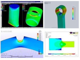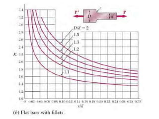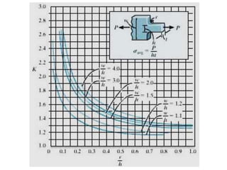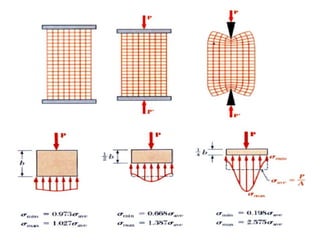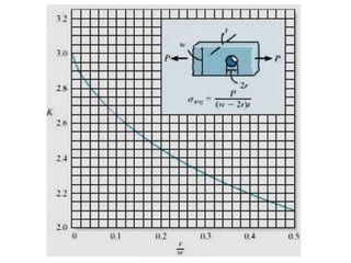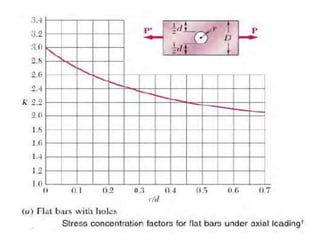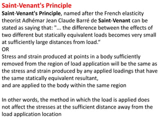 Saint-Venant's principle states that the stresses and strains far away from the load application point are unaffected by the exact nature of the load or its application method, but only depend on the resultant load magnitude and application area. Stress concentrations occur where the cross-sectional area changes abruptly, like holes, notches, or threads, and cause local stress values much higher than the average stress. The stress concentration factor K is used to relate the maximum stress σmax to the average stress σave in a cross-section. Design engineers use stress concentration factors and allowable stress values to determine if a given load will exceed the material's strength at stress concentration locations.